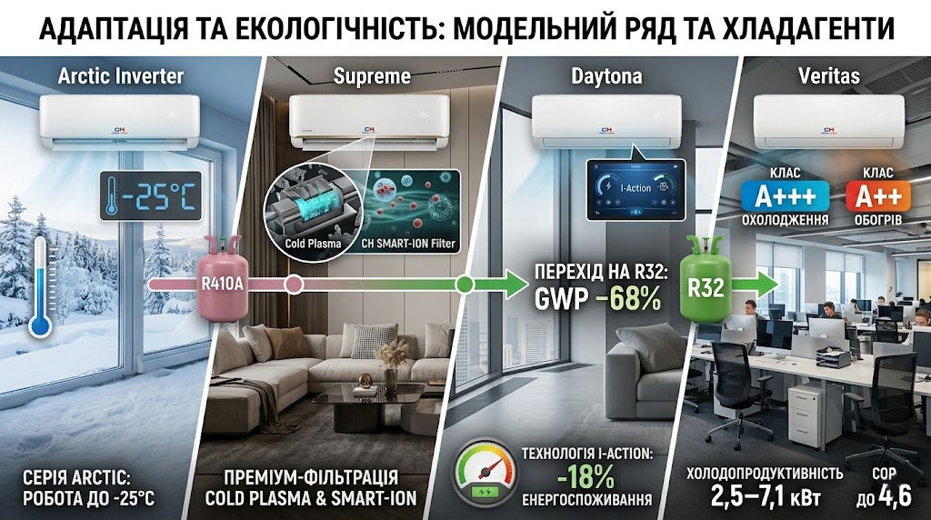 Ассортимент Cooper&Hunter структурирован по нескольким ключевым линейкам, каждая из которых ориентирована на определенный сегмент пользователей и климатические условия. Серия Arctic Inverter выделяется возможностью стабильной работы при температурах до -25°C, что делает ее актуальной для северных регионов. В свою очередь, Supreme и Veritas ориентированы на премиальный сегмент, предлагая расширенные функции фильтрации воздуха, включая Cold Plasma и CH SMART-ION Filter.