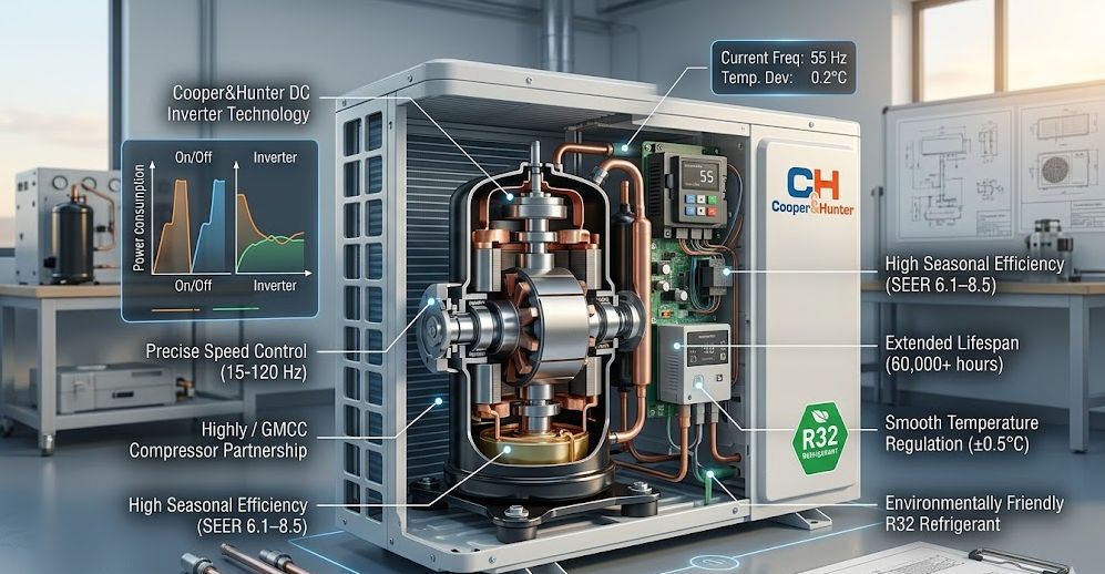 Особое внимание уделяется технологии DC Inverter, которая позволяет регулировать частоту вращения двигателя компрессора в диапазоне от 15 до 120 Гц. Это обеспечивает плавное поддержание температуры с отклонением не более ±0,5°C. В профессиональной среде подчеркивается, что именно cooper&hunter компрессор демонстрирует высокий ресурс работы — до 60 000 часов при правильной эксплуатации, что подтверждается исследованиями HVAC-инженеров из ASHRAE (American Society of Heating, Refrigerating and Air-Conditioning Engineers).